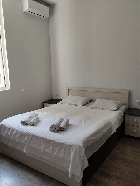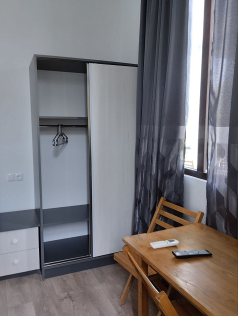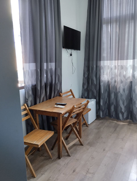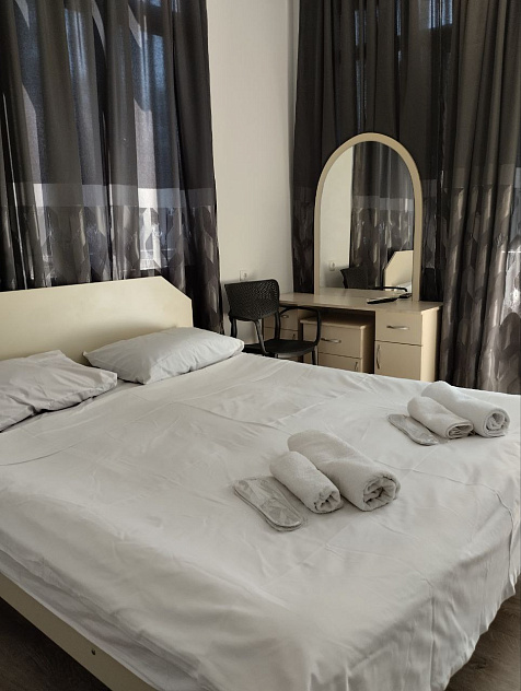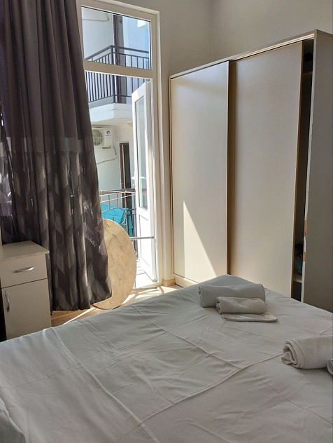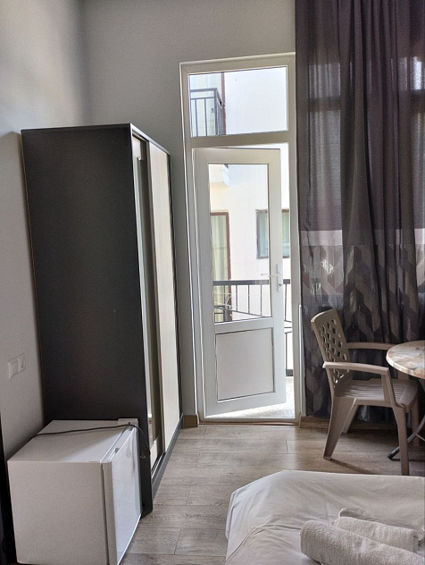 Номера светлые, с французскими окнами во всю стену, с кондиционером, телевизором, холодильником, шкафом-купе.