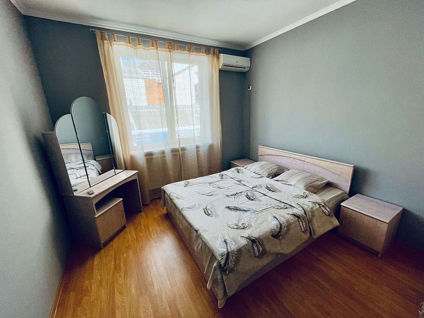 двуспальные кровати, диван-кровать, тахта, шкаф, комод, стол, стулья, прикроватные тумбочки, журнальный столик, вешалка, зеркало, кухонный гарнитур, обеденная зона. сплит-система, телевизор, цифровое ТВ, холодильник, интернет, СВЧ, эл. чайник, посуда. Санузел + душ в номере.