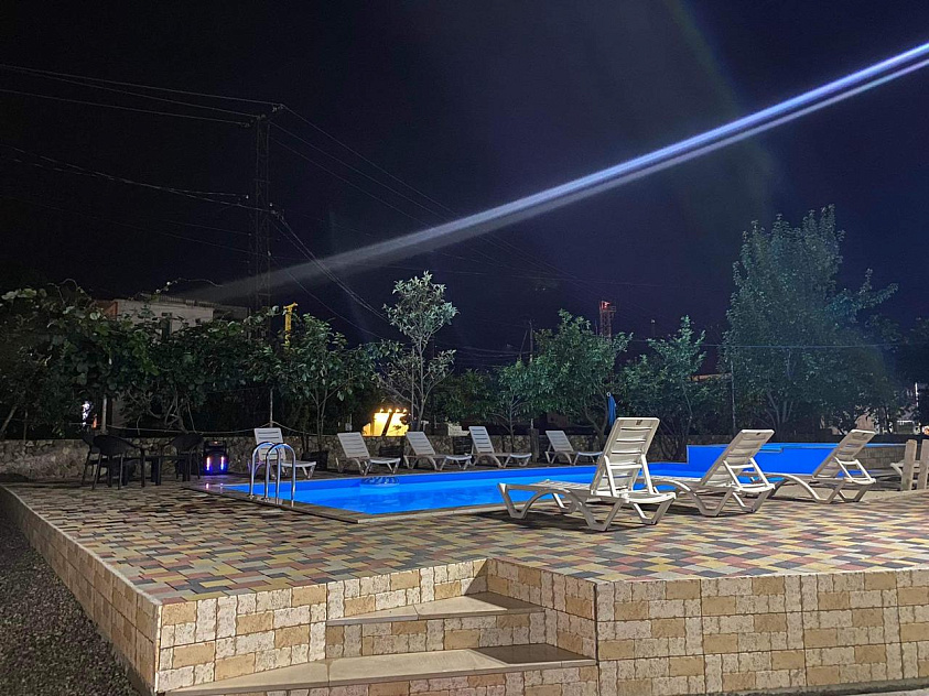 На улице, общая зона отдыха, бассейн, шезлонги, сад, барбекю.